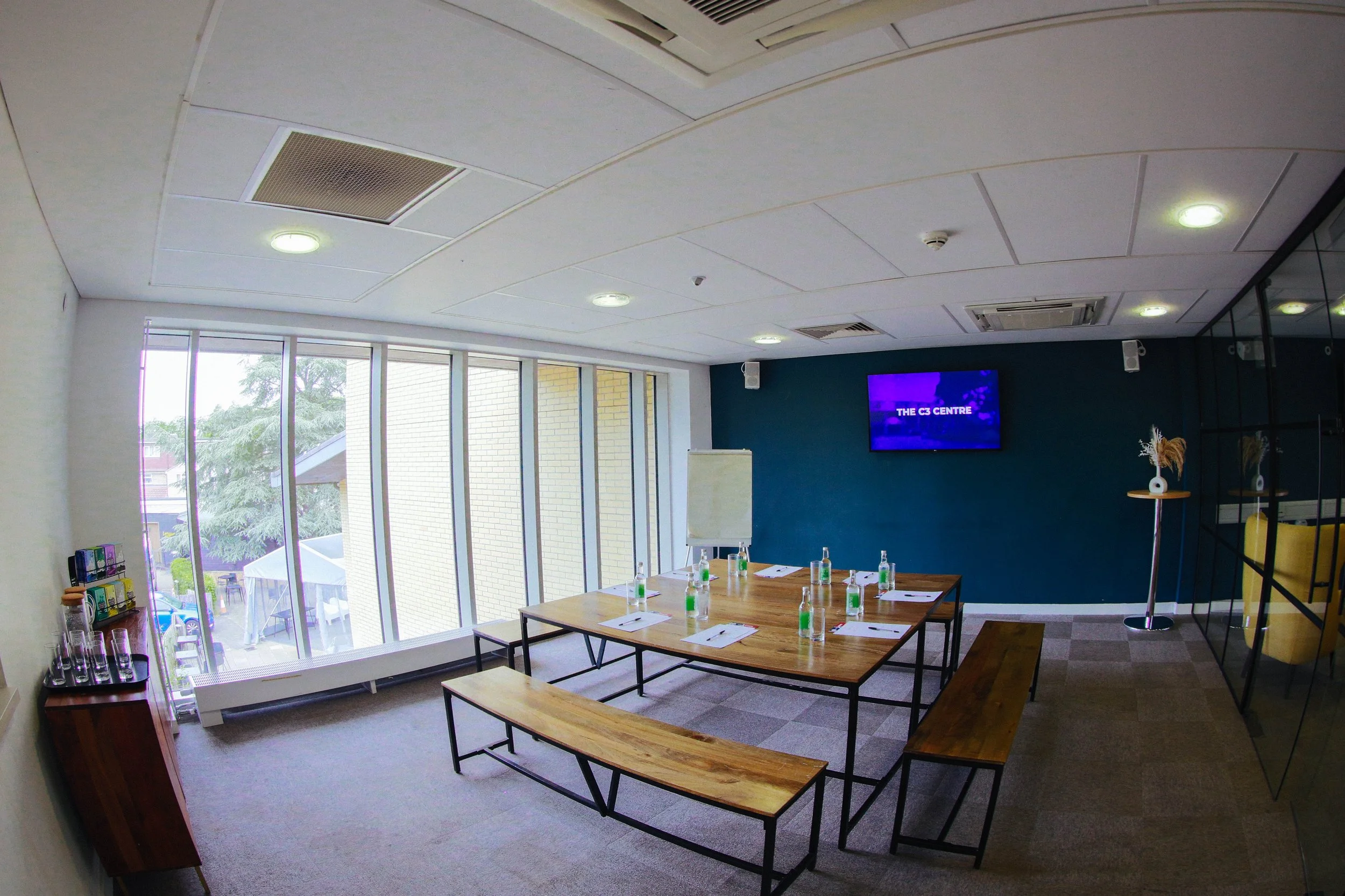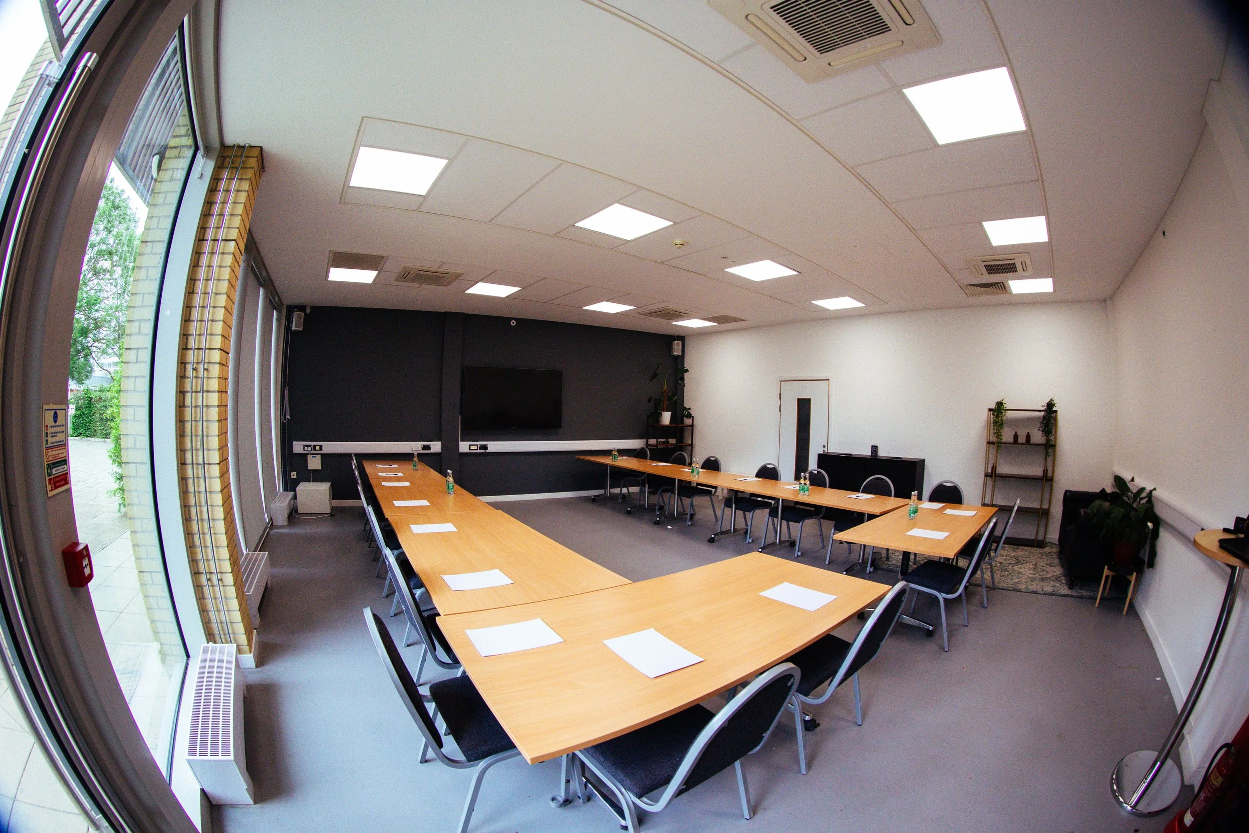 Flexible meeting and breakout spaces designed for workshops, training, and group sessions. Rooms can be configured in multiple layouts, including a divisible space, with connected TV screens available for seamless presentations and collaboration.